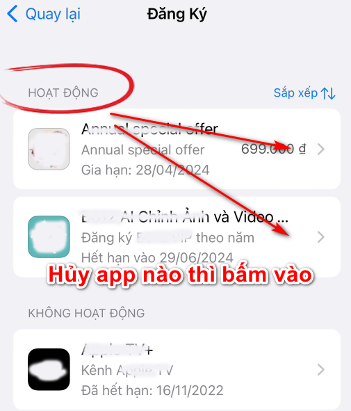 Muốn hủy phần mềm nào, bấm vào phần mềm đó ở mục "Hoạt động" (là đang mua, đang đăng ký).