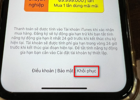 Có nghĩa, giả sử bạn mua 1 tháng hay 1 tuần, mà ngay ngày hôm sau nó nhảy ra nút yêu cầu thanh toán, chỉ việc kéo xuống dưới, bấm vào khôi phục là xong. (Lỗi do appstore không xử lý chứ không do app bạn nhé)